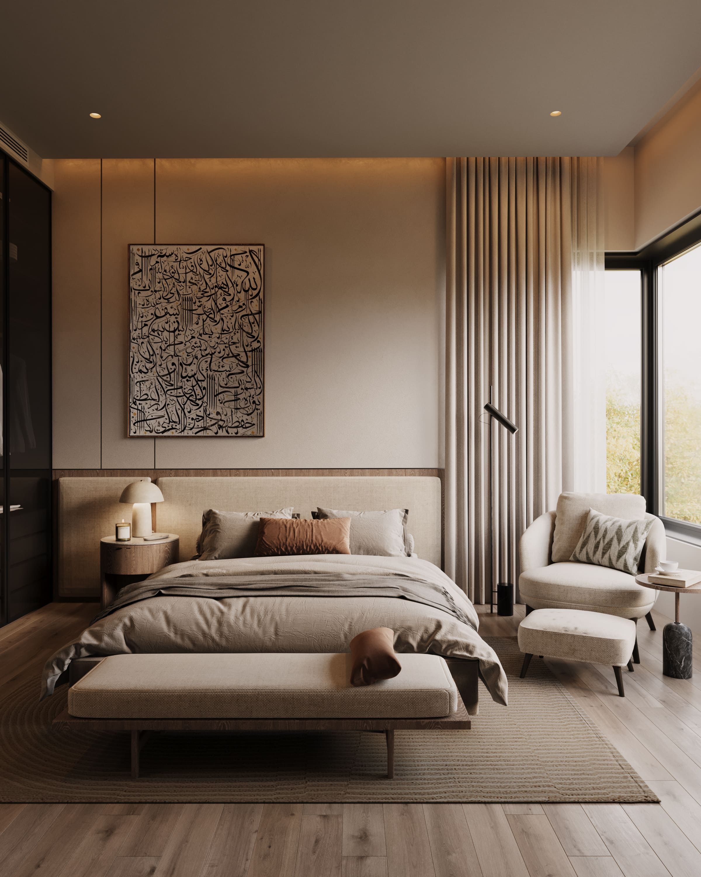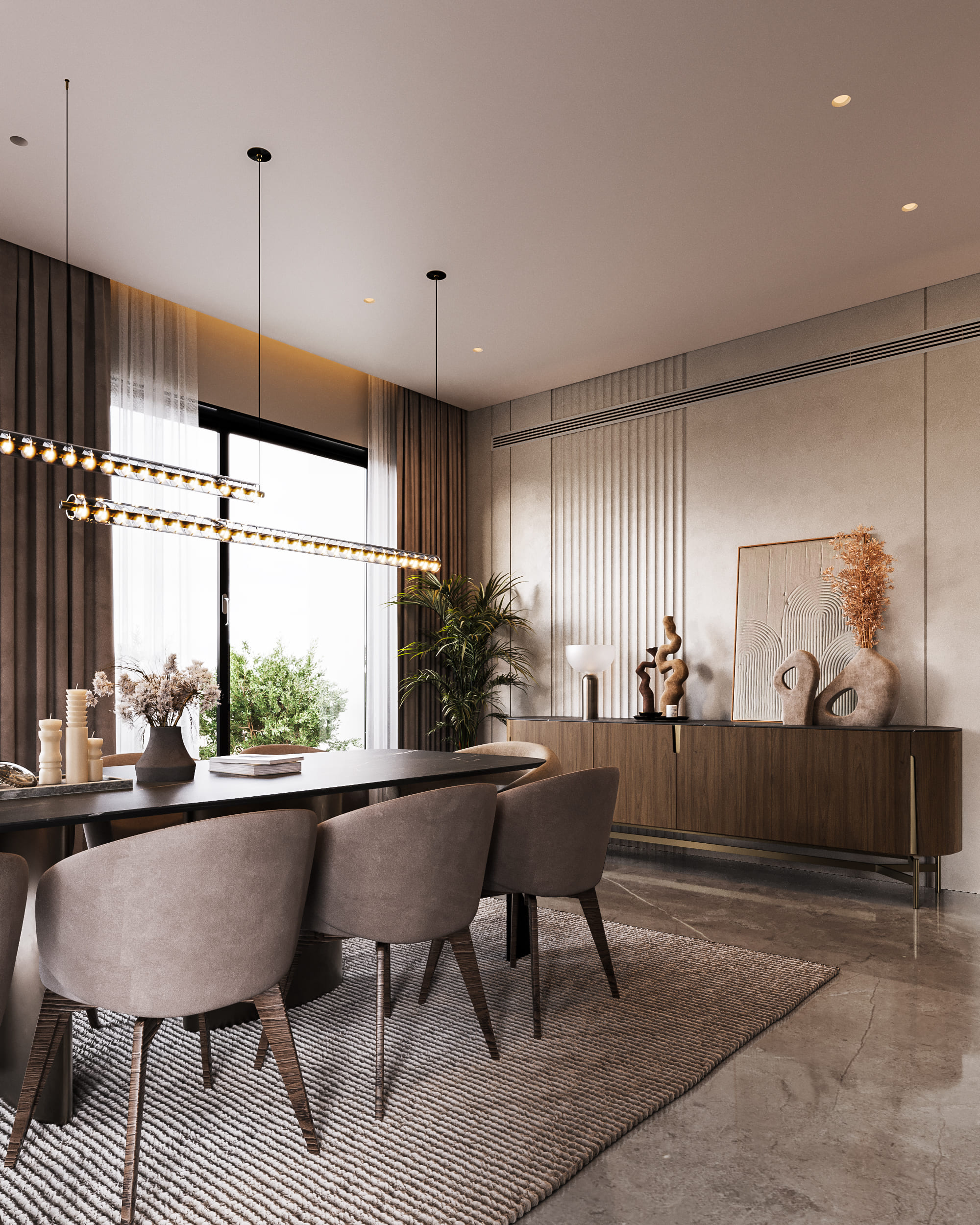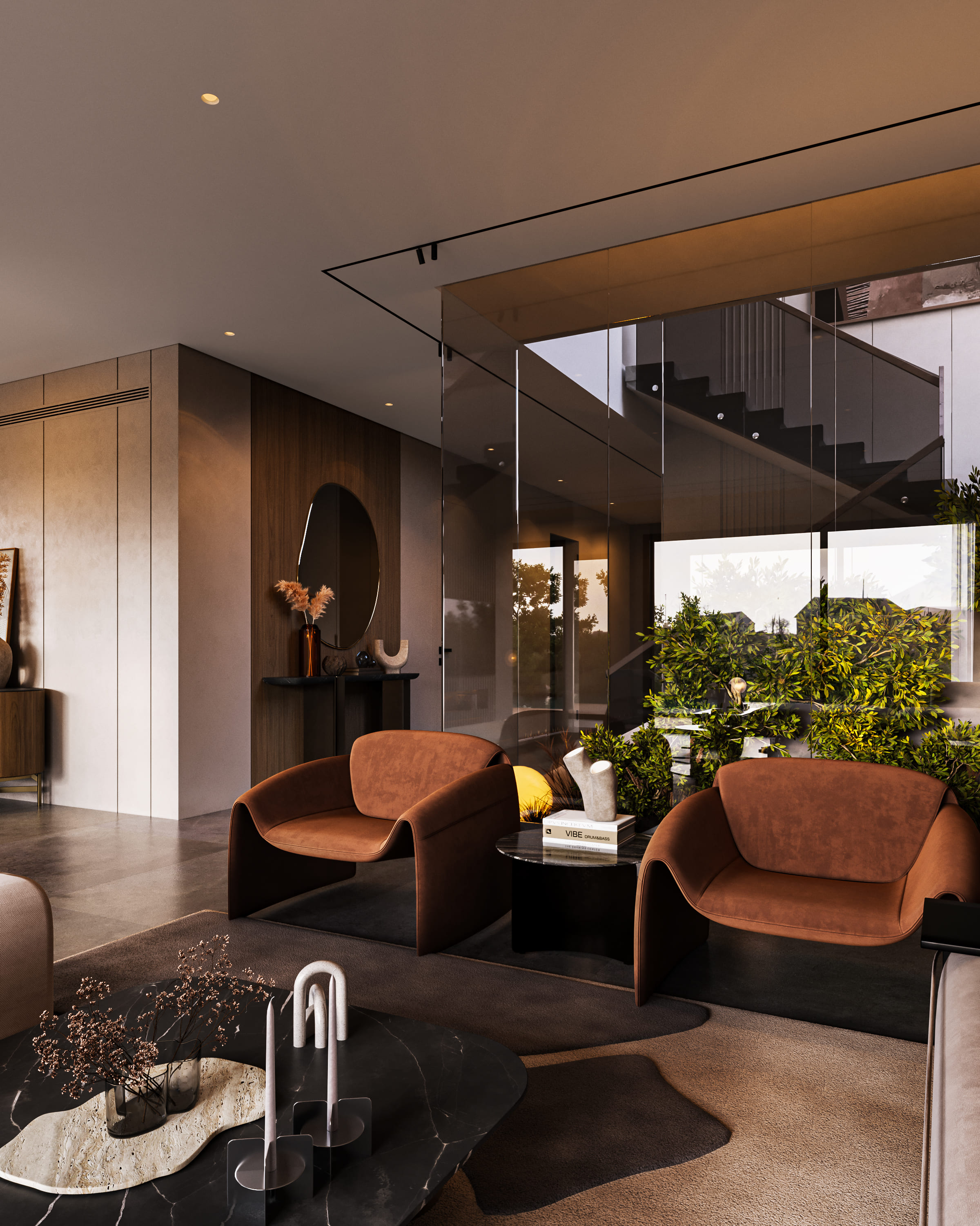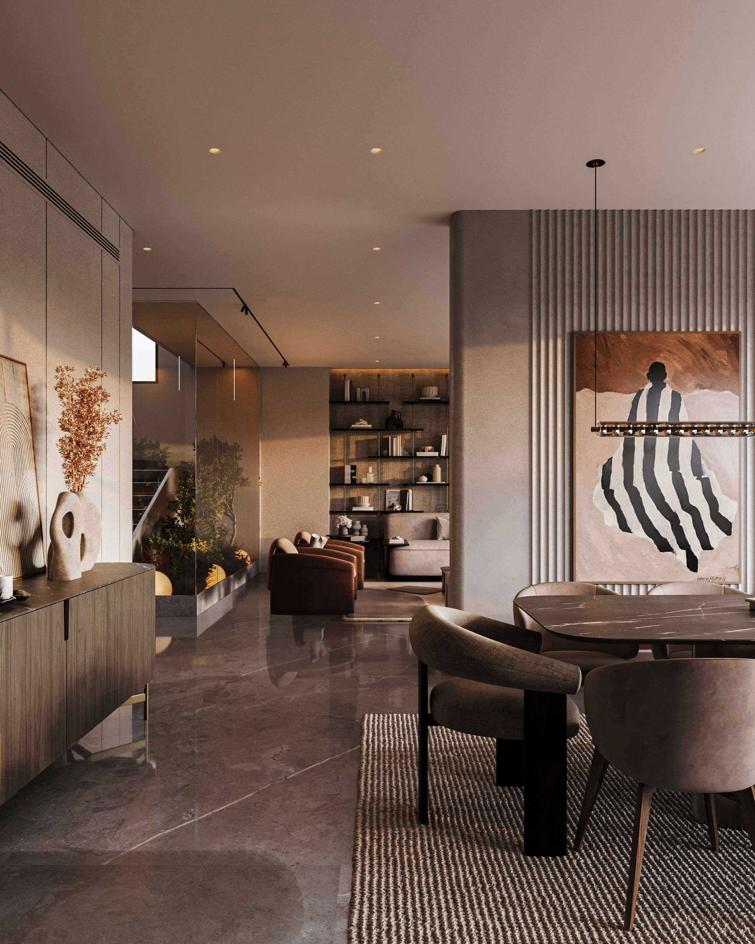 The New Giza Villa embraces a minimal contemporary language while integrating organic materials. Generous glazing opens to a private courtyard. Interiors feature warm wood tones, polished concrete floors, and custom millwork. Landscaped courtyards with native planting create an oasis in the desert. Indoor–outdoor living is maximized with expansive sliding doors and sun shading devices. Thoughtful detail in reception, living areas, kitchen, and bedrooms reinforces a sense of calm sophistication.