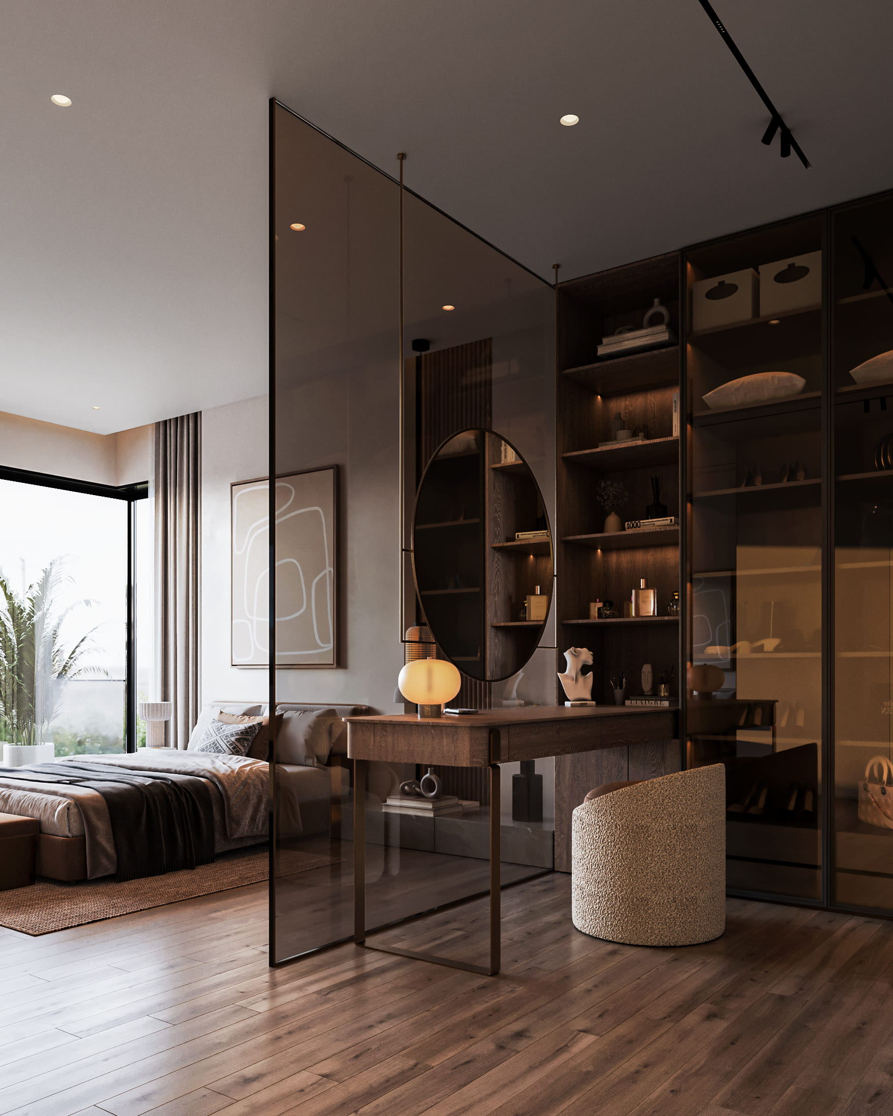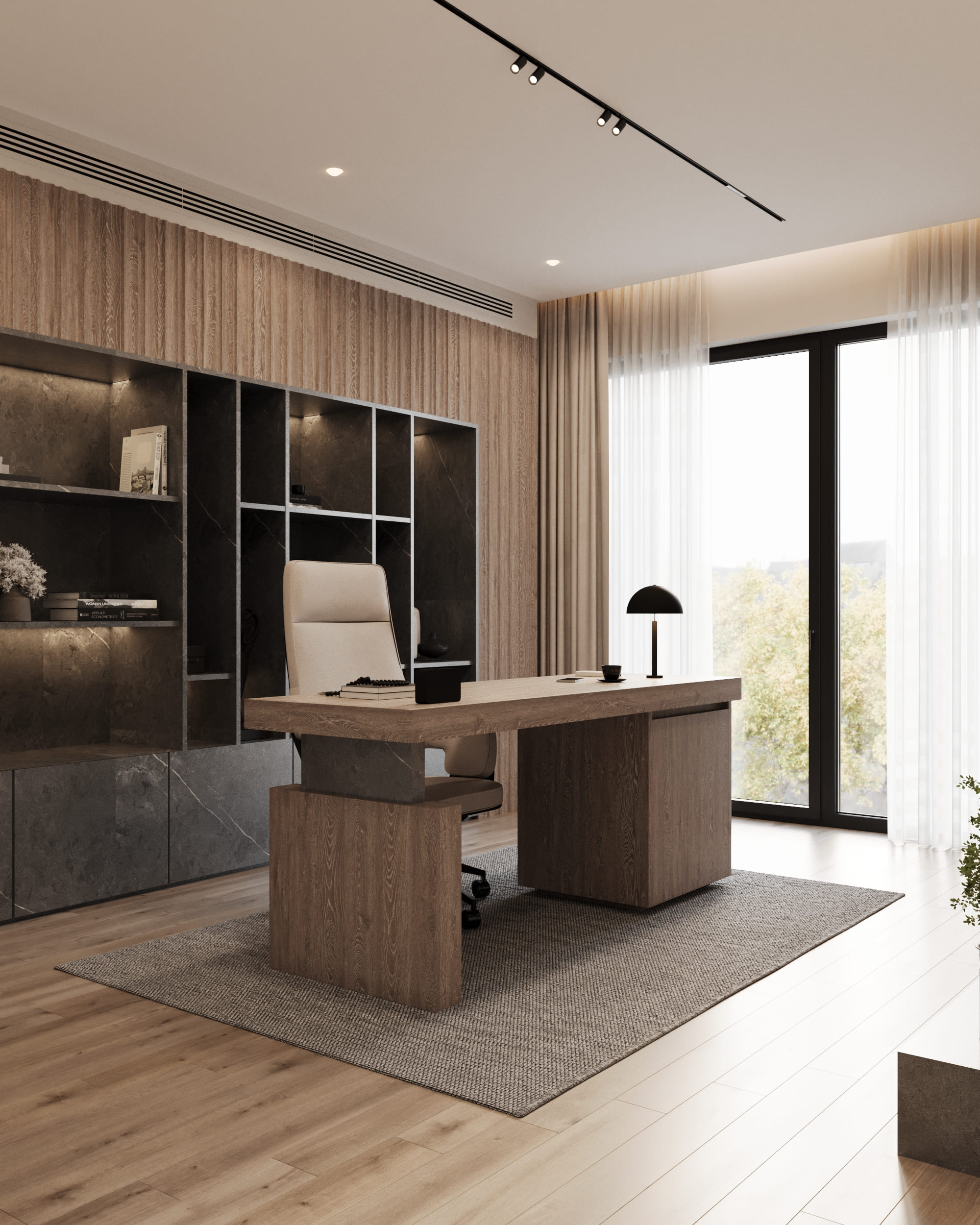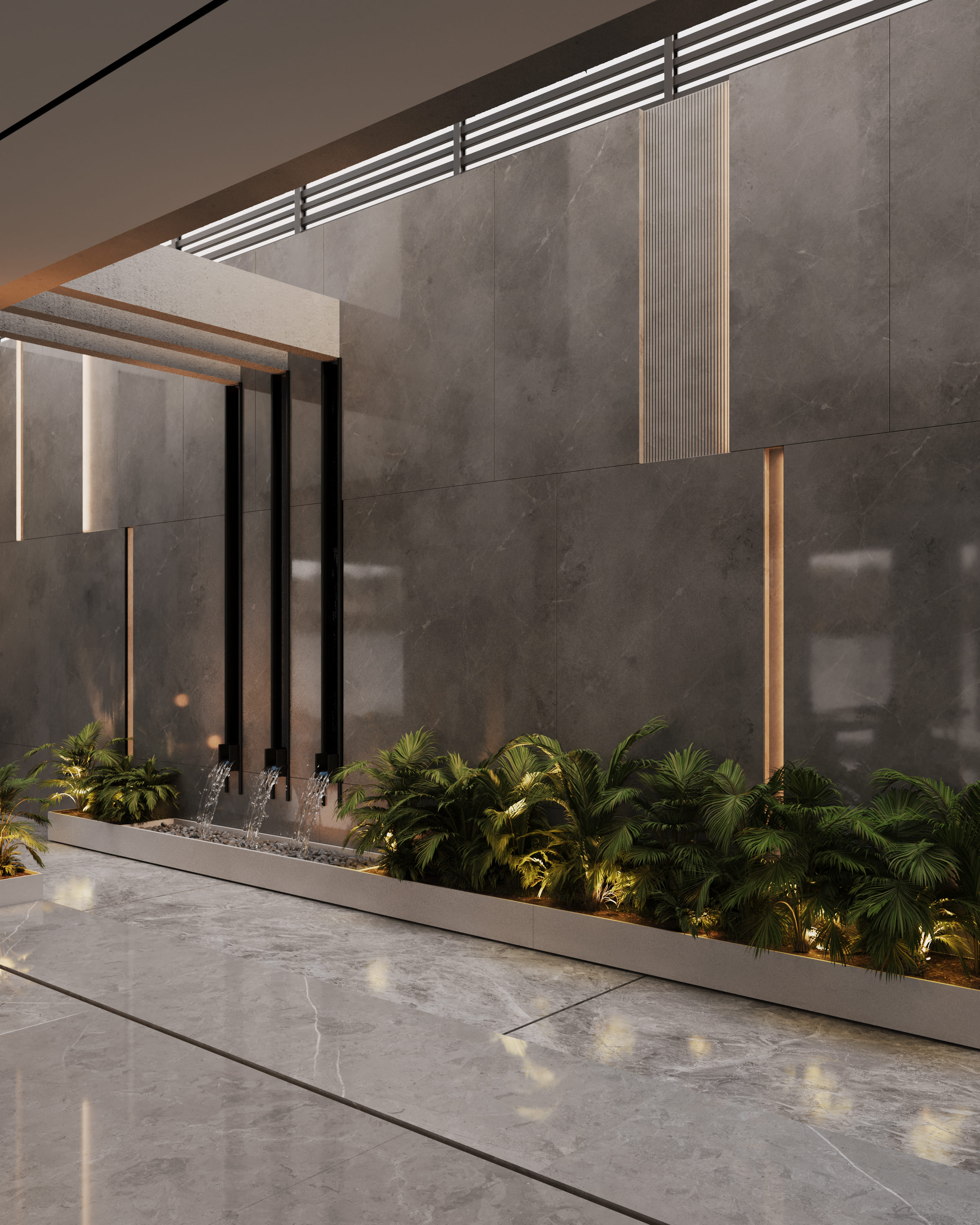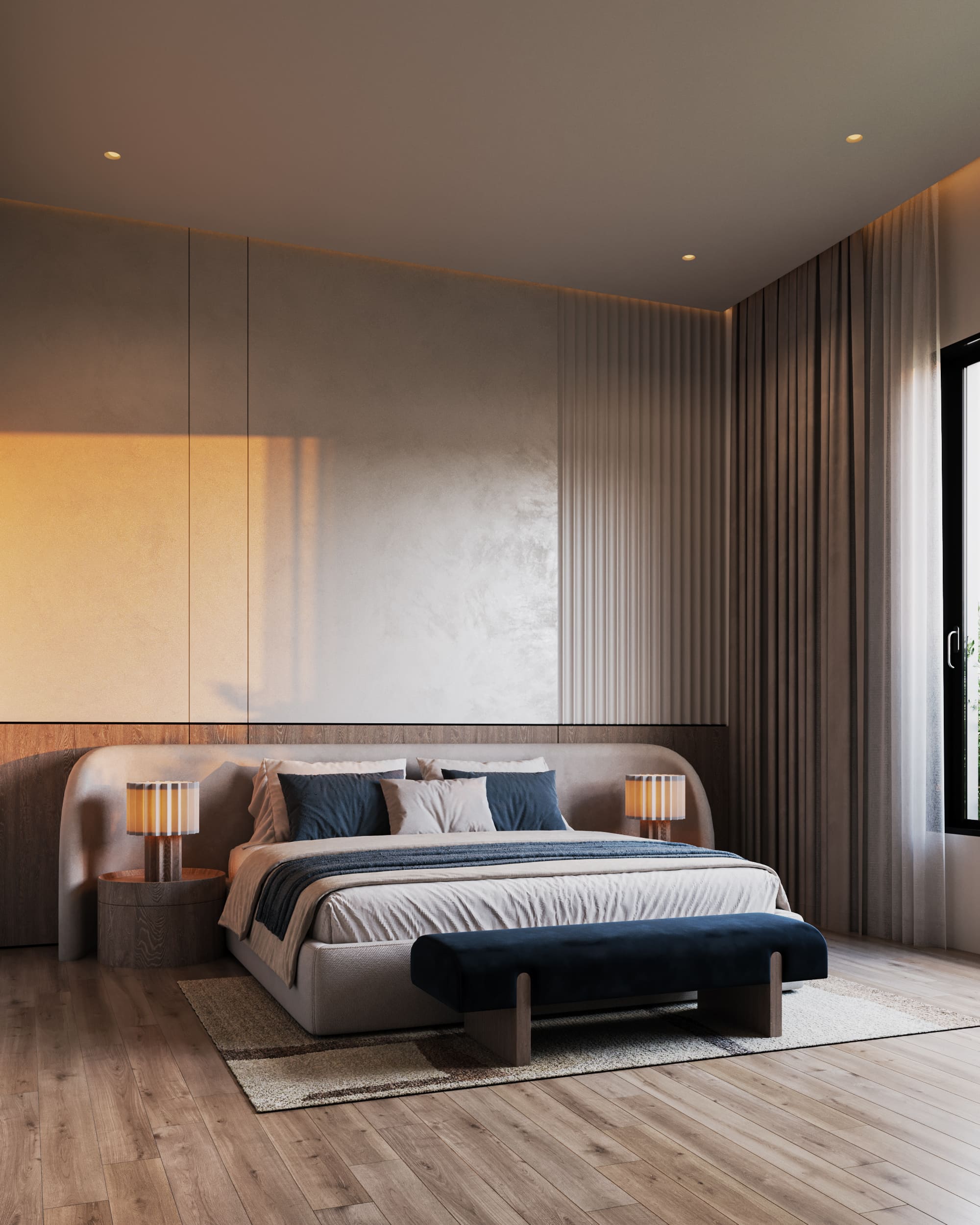 The New Giza Villa embraces a minimal contemporary language while integrating organic materials. Generous glazing opens to a private courtyard. Interiors feature warm wood tones, polished concrete floors, and custom millwork. Landscaped courtyards with native planting create an oasis in the desert. Indoor–outdoor living is maximized with expansive sliding doors and sun shading devices. Thoughtful detail in reception, living areas, kitchen, and bedrooms reinforces a sense of calm sophistication.
