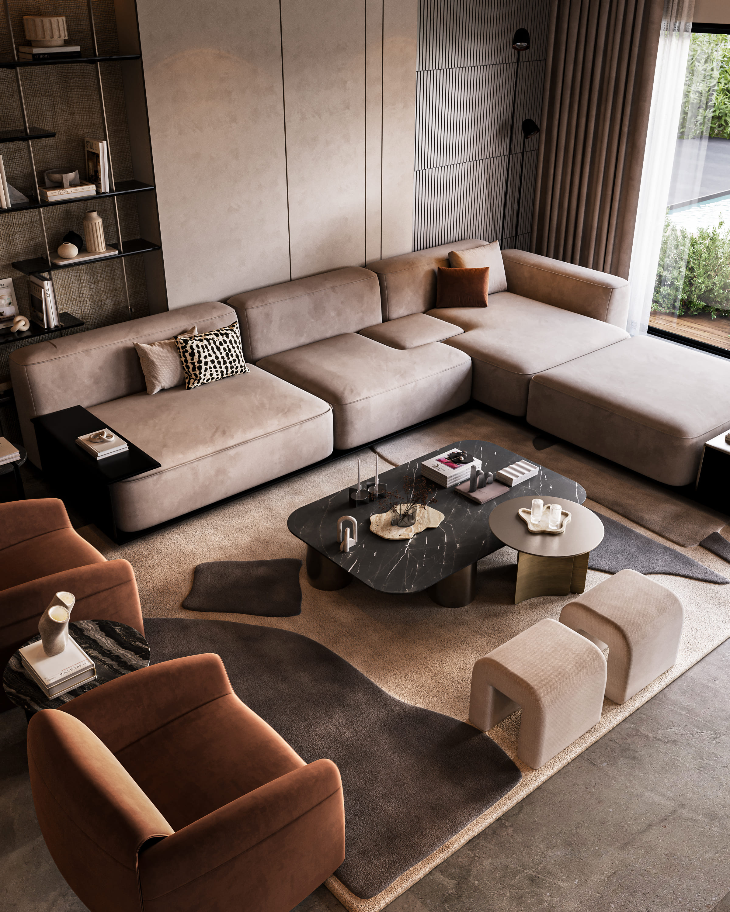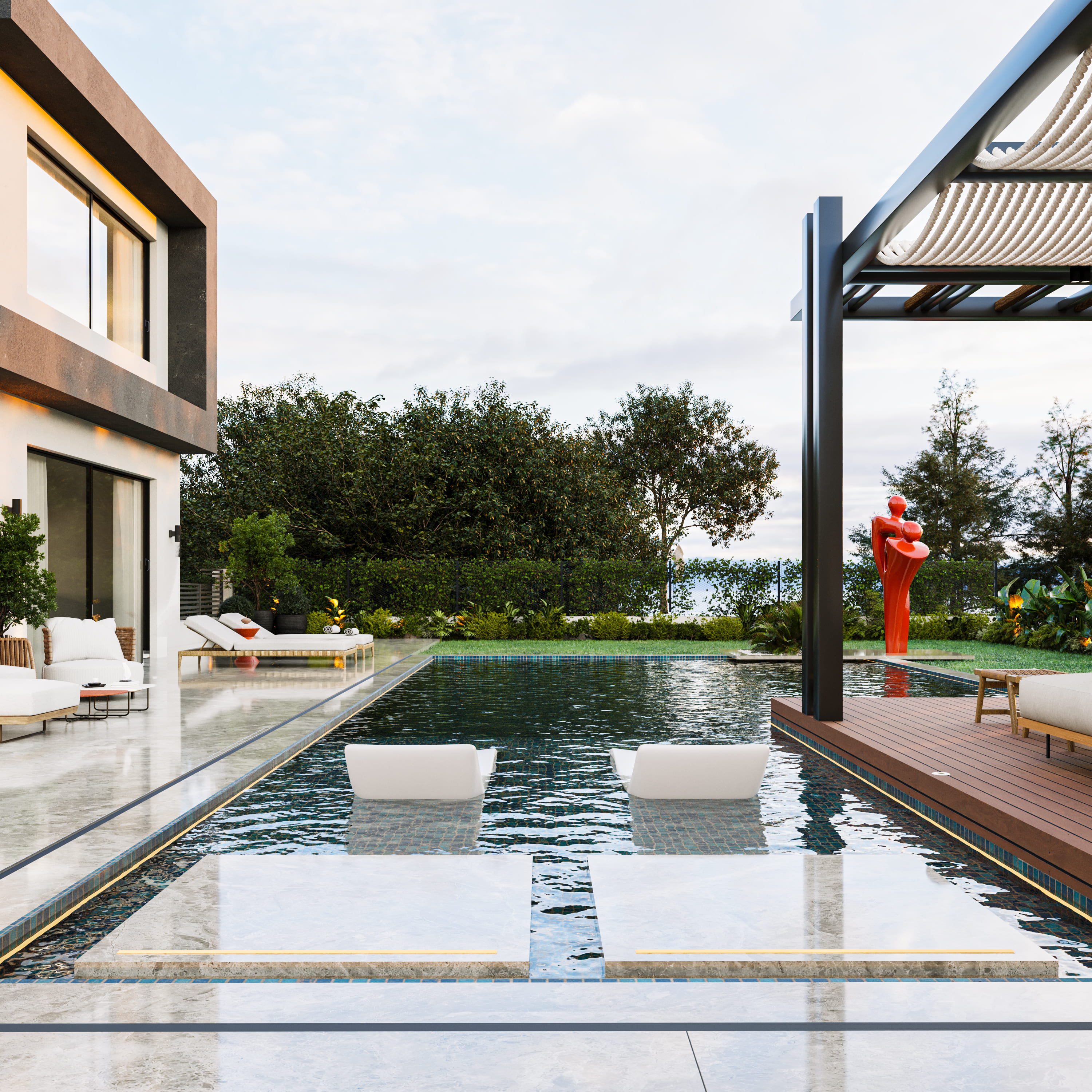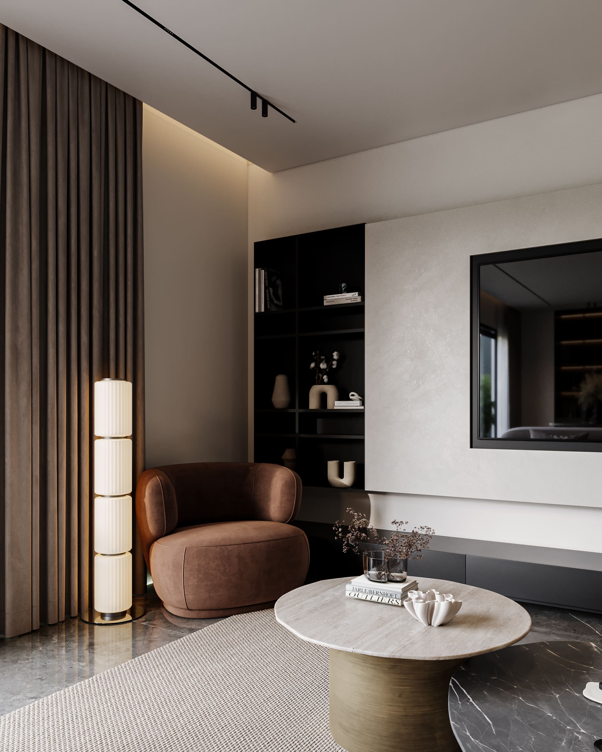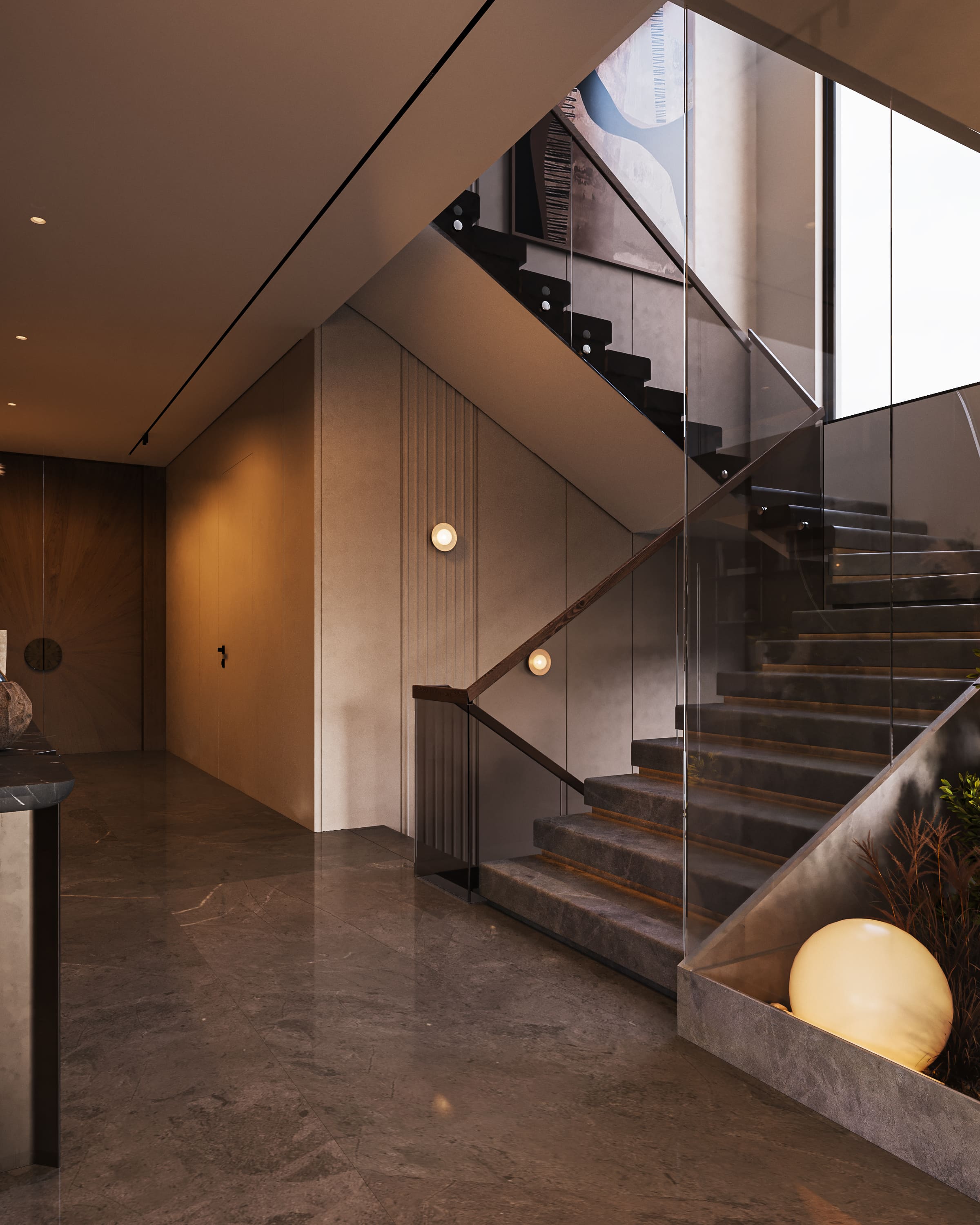 The New Giza Villa embraces a minimal contemporary language while integrating organic materials. Generous glazing opens to a private courtyard. Interiors feature warm wood tones, polished concrete floors, and custom millwork. Landscaped courtyards with native planting create an oasis in the desert. Indoor–outdoor living is maximized with expansive sliding doors and sun shading devices. Thoughtful detail in reception, living areas, kitchen, and bedrooms reinforces a sense of calm sophistication.
