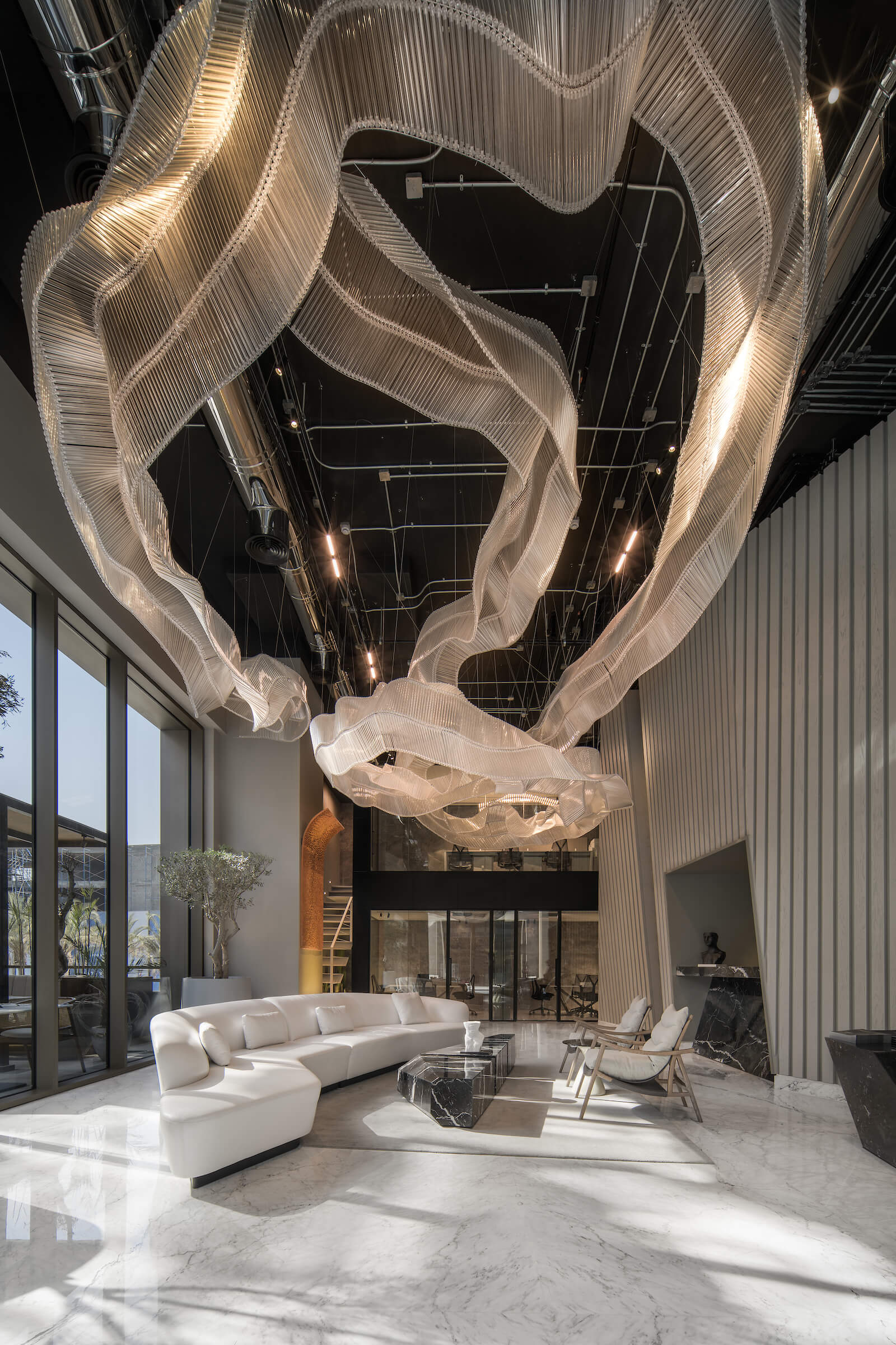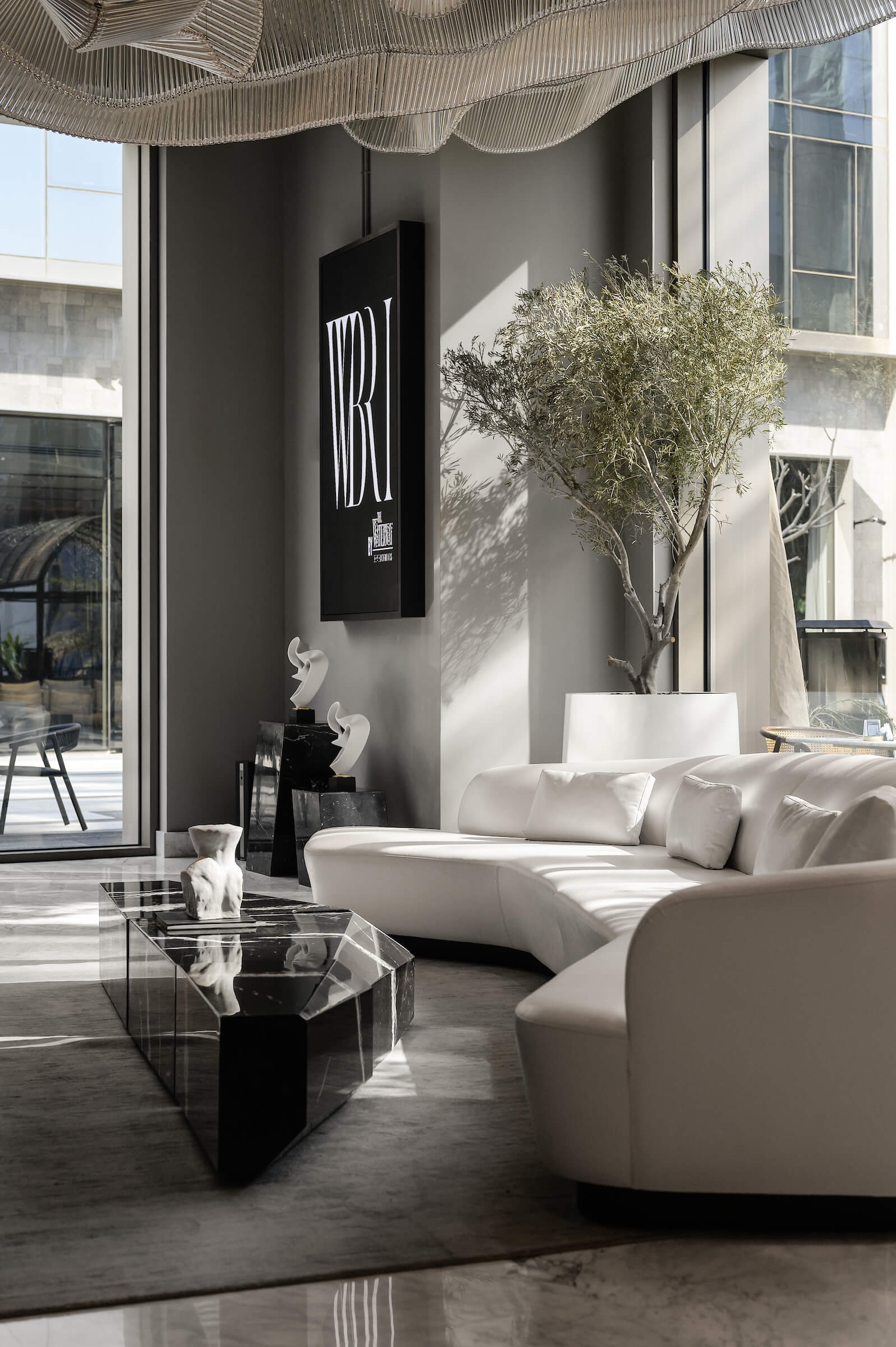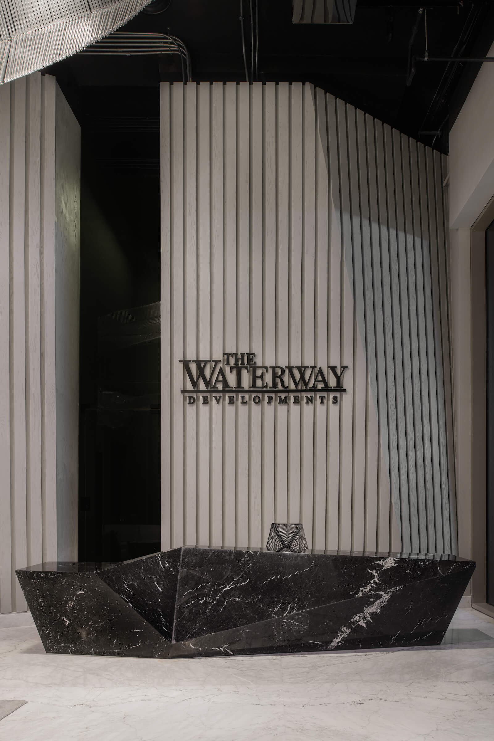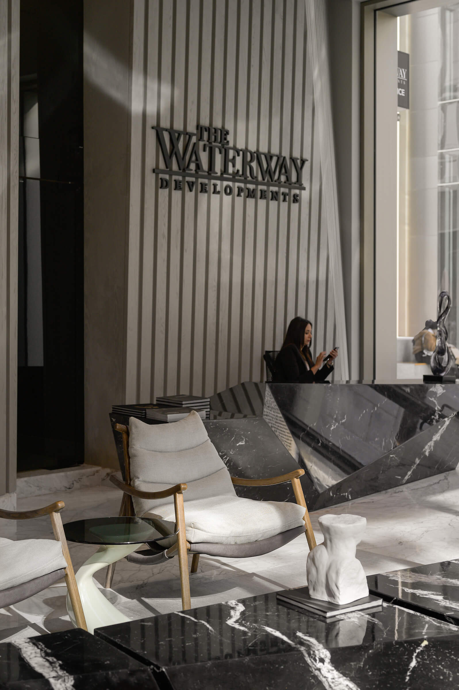 The Water Way Sales Centre is a luxurious spatial statement, defined by a refined grey palette and a balance of bold materials and minimalist design. A striking chandelier hangs as a sculptural centerpiece, anchoring the interior with dramatic elegance. The design contrasts light wood finishes and black marble accents, creating a sophisticated tension between warmth and depth. An exposed industrial ceiling adds raw character, while clean, minimal lines ensure clarity and flow. A monumental curved sofa invites interaction and softness, reinforcing the curated atmosphere.