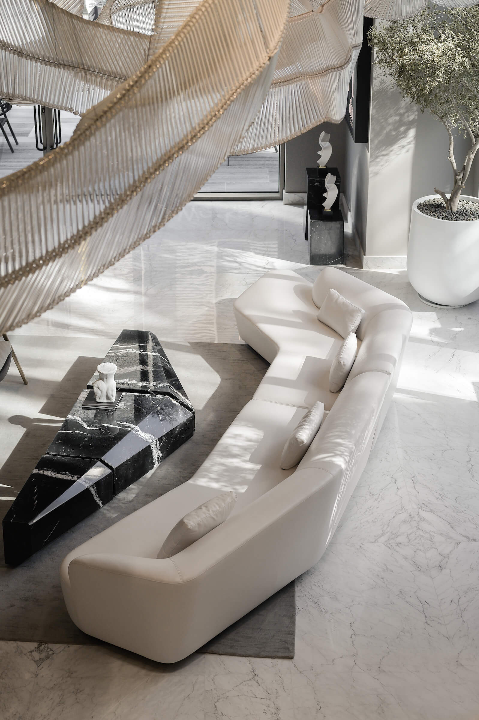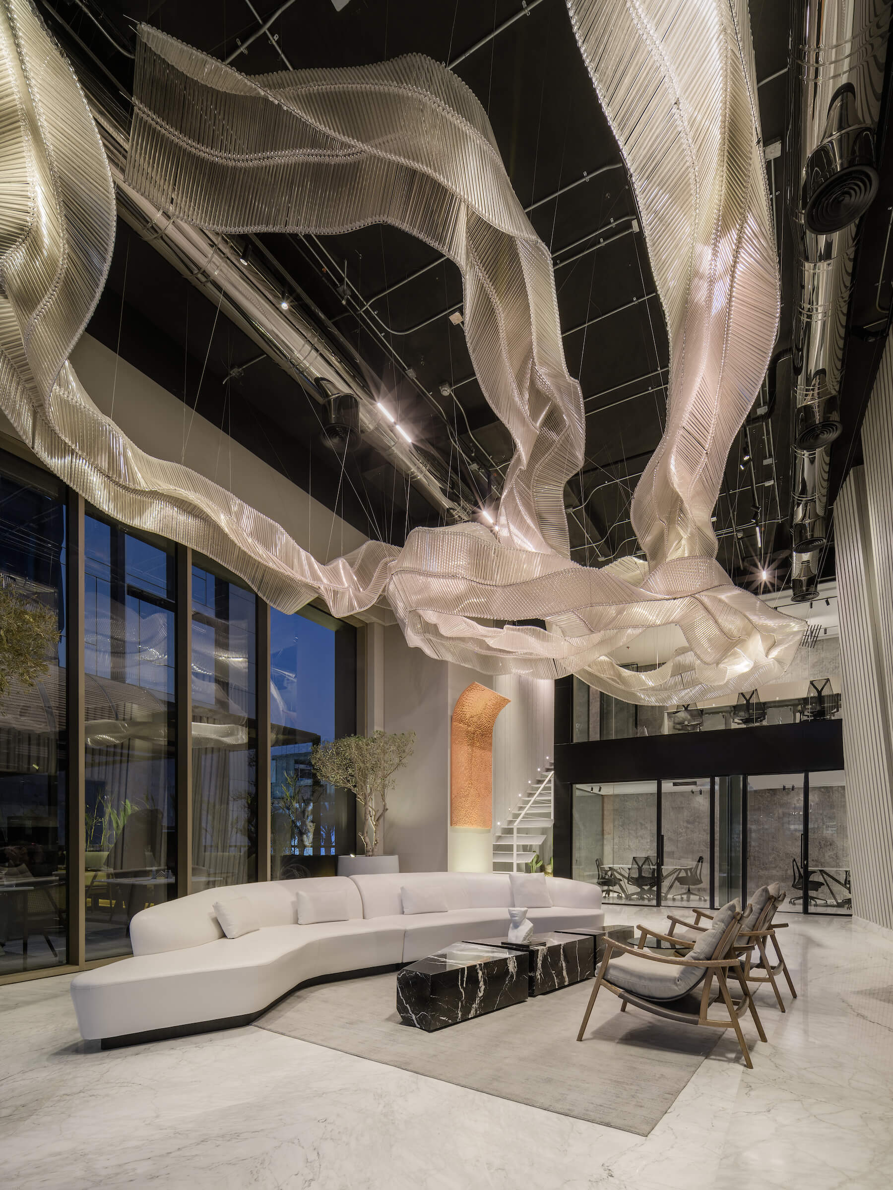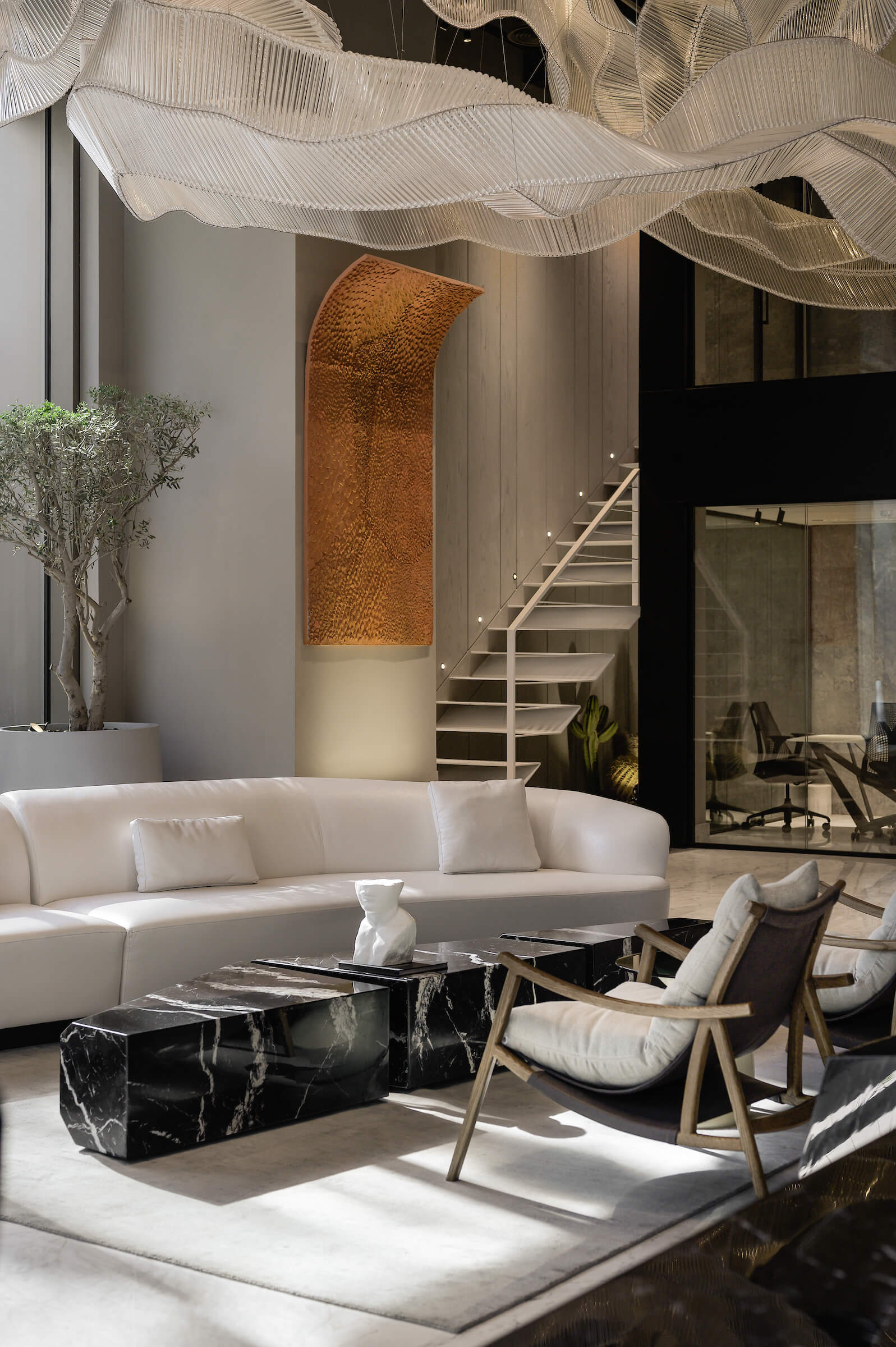 The Water Way Sales Centre is a luxurious spatial statement, defined by a refined grey palette and a balance of bold materials and minimalist design. A striking chandelier hangs as a sculptural centerpiece, anchoring the interior with dramatic elegance. The design contrasts light wood finishes and black marble accents, creating a sophisticated tension between warmth and depth. An exposed industrial ceiling adds raw character, while clean, minimal lines ensure clarity and flow. A monumental curved sofa invites interaction and softness, reinforcing the curated atmosphere.