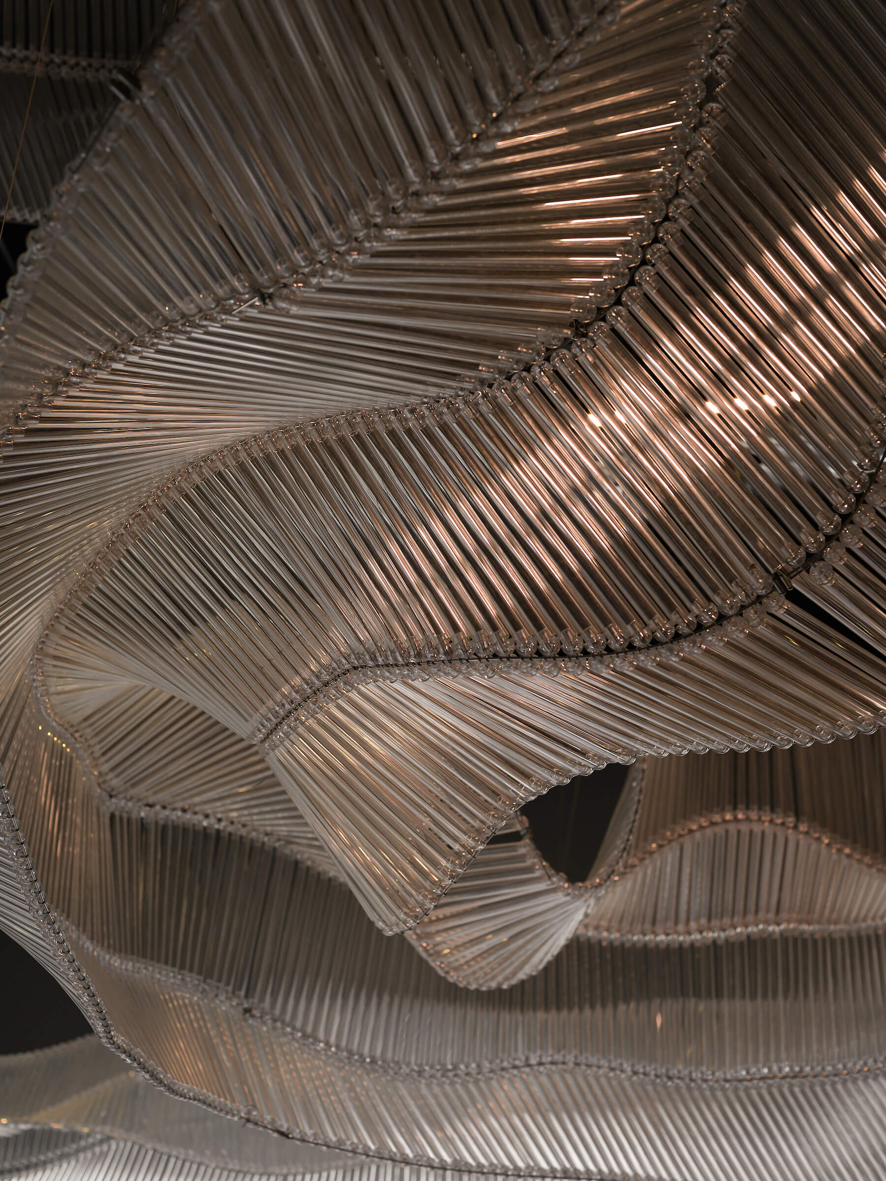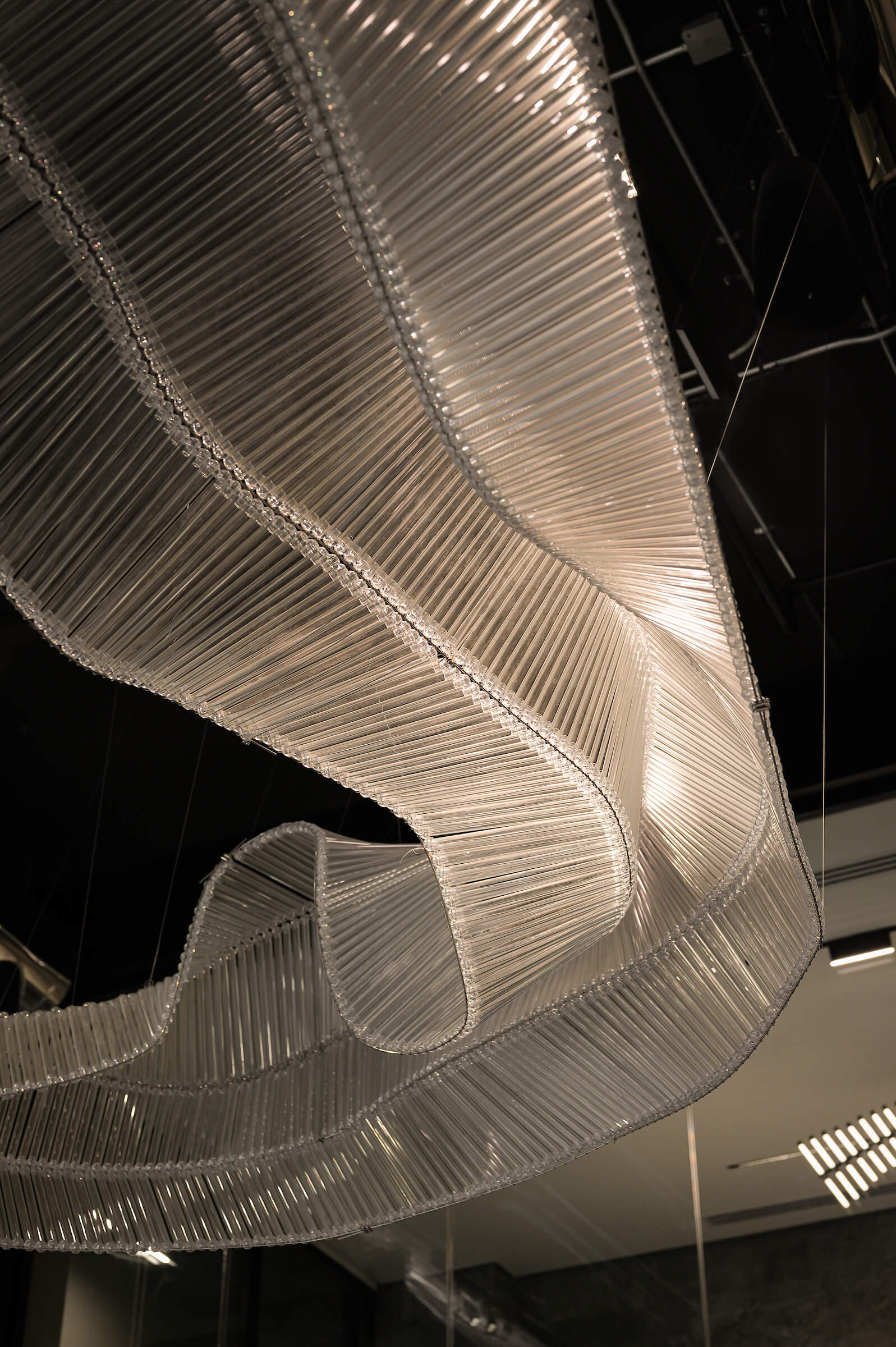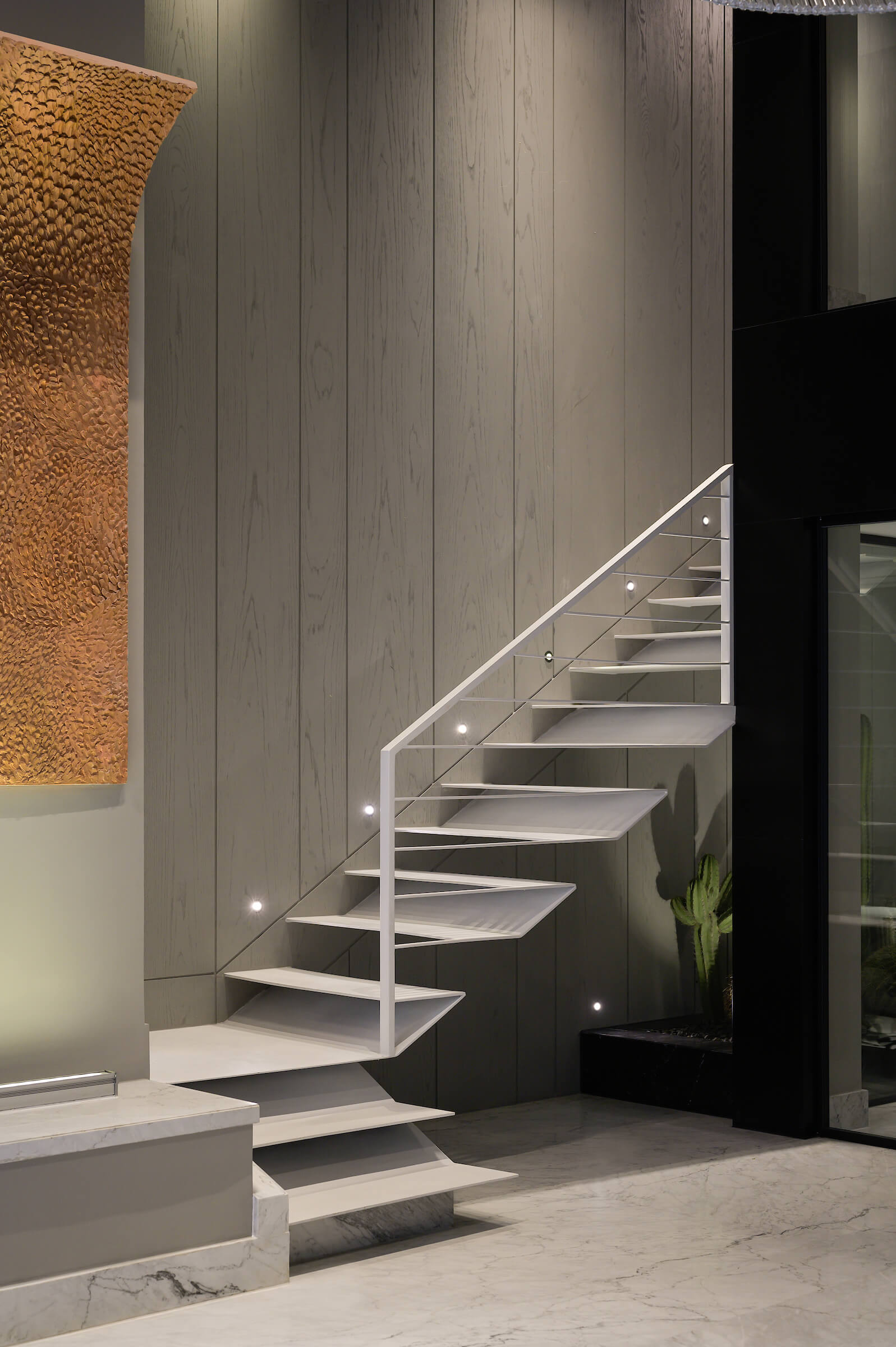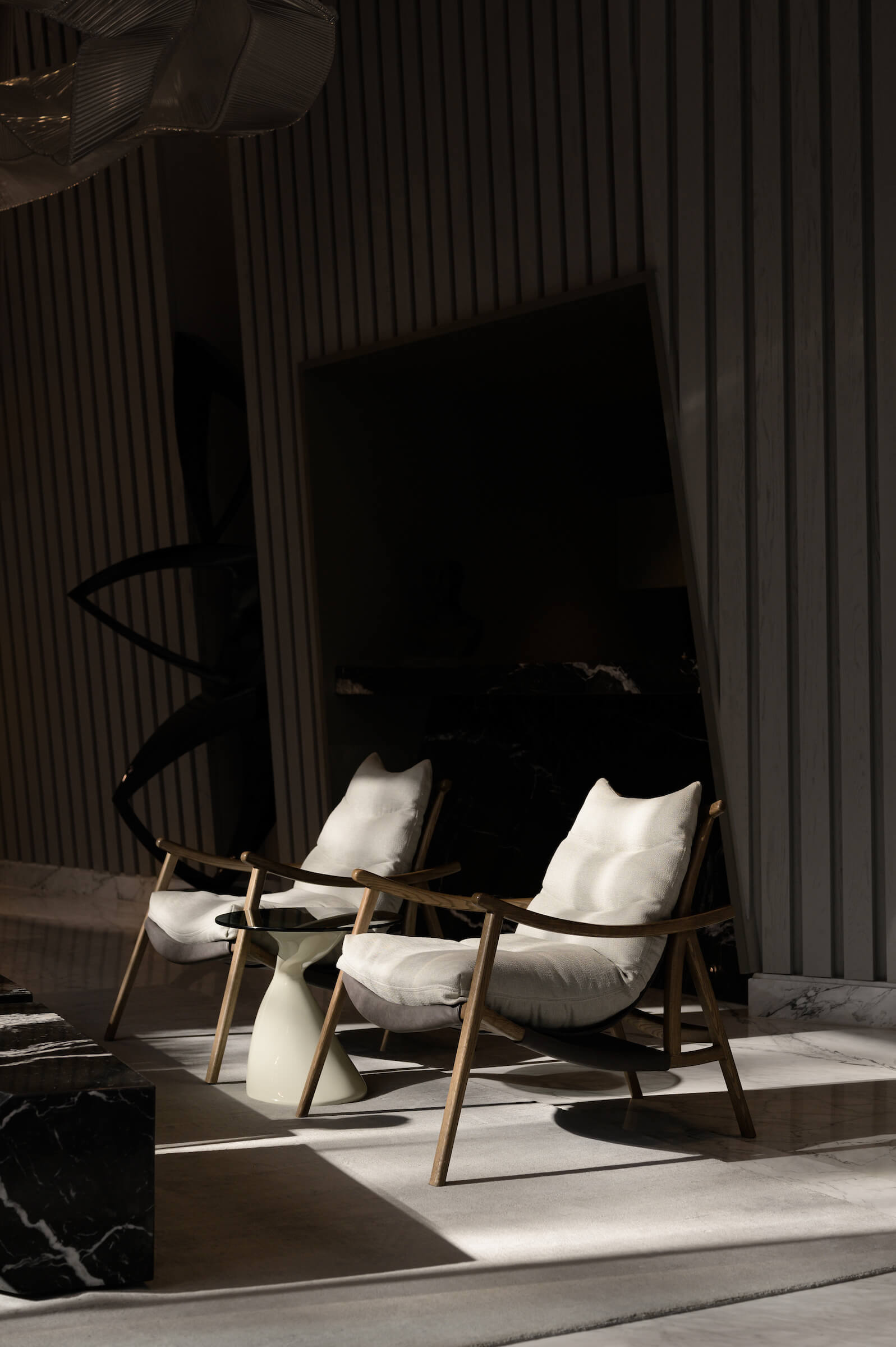 The Water Way Sales Centre is a luxurious spatial statement, defined by a refined grey palette and a balance of bold materials and minimalist design. A striking chandelier hangs as a sculptural centerpiece, anchoring the interior with dramatic elegance. The design contrasts light wood finishes and black marble accents, creating a sophisticated tension between warmth and depth. An exposed industrial ceiling adds raw character, while clean, minimal lines ensure clarity and flow. A monumental curved sofa invites interaction and softness, reinforcing the curated atmosphere.